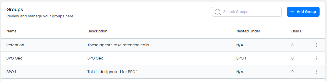 For example, a BPO may have 40 clients, so they would create 40 separate Groups. If one client has three main lines of business—Customer Support, Retention, and Sales—each can be created as a sub-Group “nested under” that client. Each account manager for the client would then have access only to their assigned department while still remaining within the overall client Group.